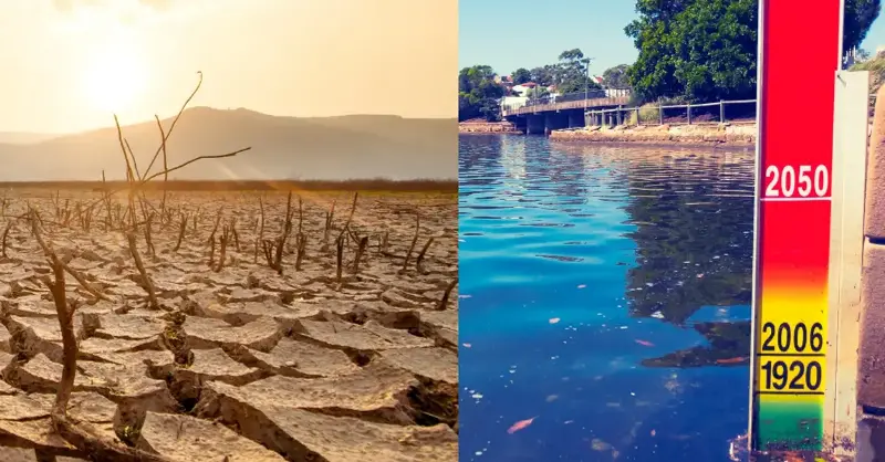 From a scientific perspective, drought and sea level rise are two manifestations of changes in the global energy balance and water cycle. As the climate warms, evaporation from land and ocean increases, causing a lack of moisture on land (drought) while at the same time melting polar ice and thermal expansion of ocean water, causing water levels to rise.